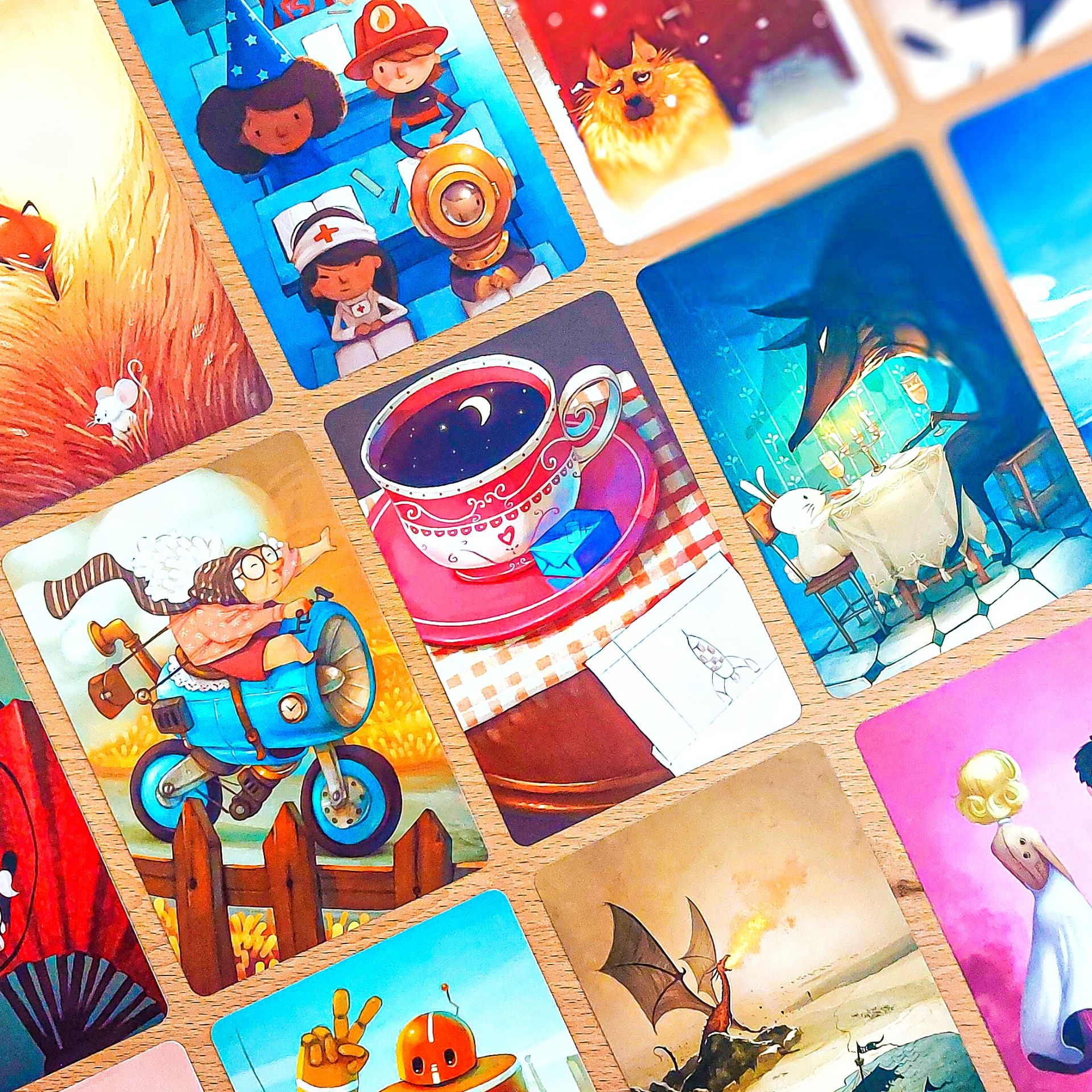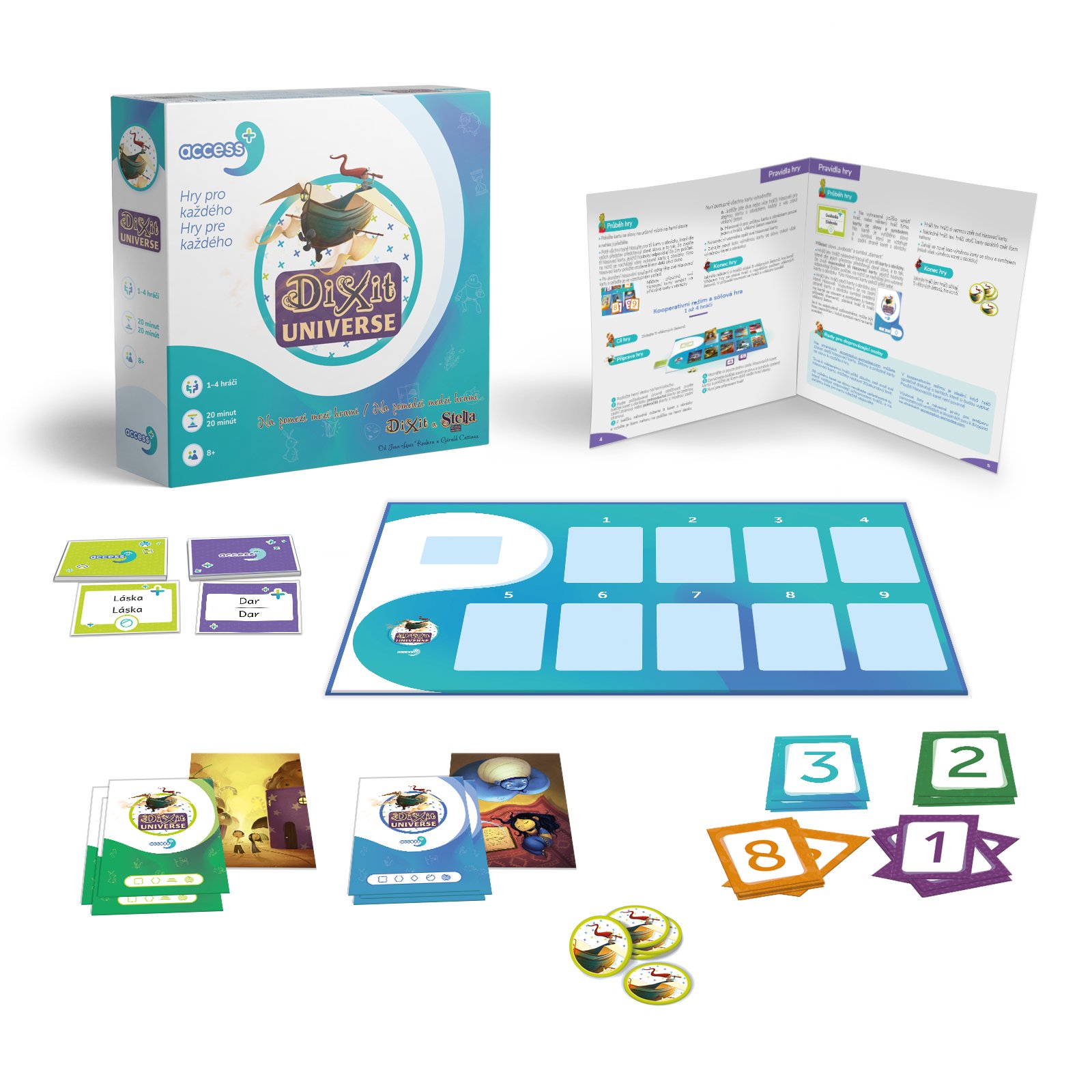 - 1 herní deska Dixit Access+ s 9 číslovanými políčky pro karty s obrázky + 1 políčko pro kartu se slovy