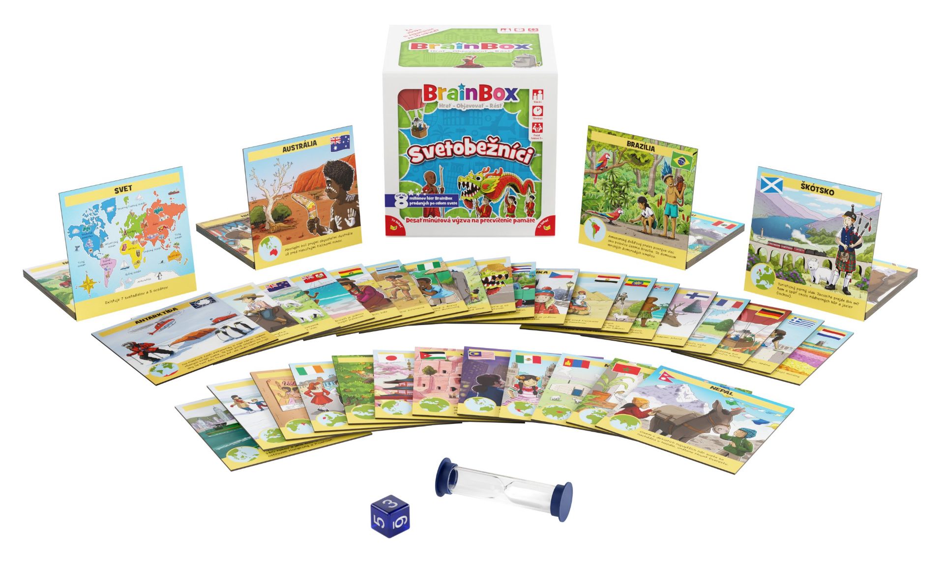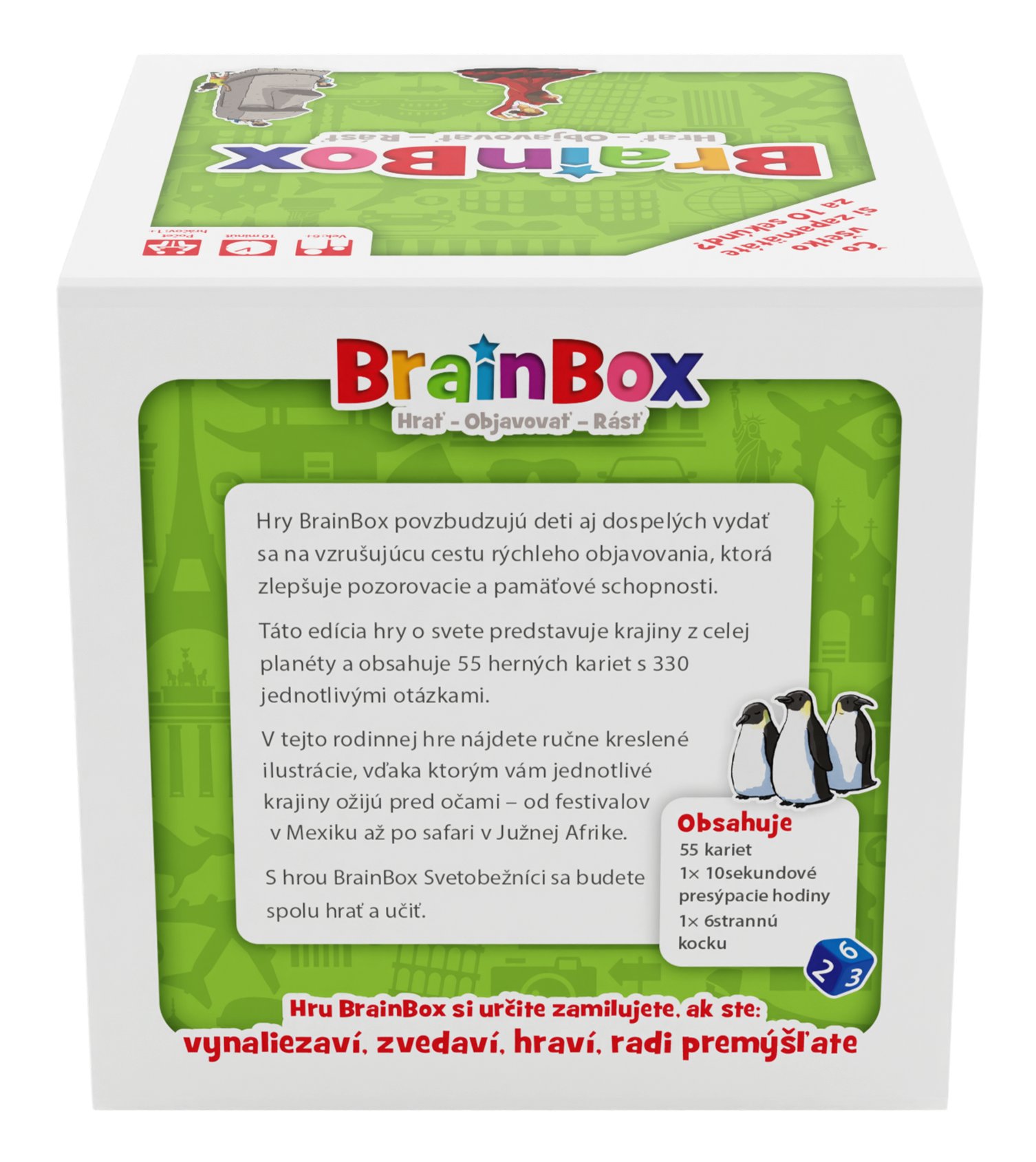 Vstúpte do sveta vzdelávania a zábavy s hrou "BrainBox - Svet"! Táto zábavná kartová hra na pamäť a pozornosť preverí vaše pozorovacie schopnosti a vedomosti o krajinách po celom svete. Na preštudovanie každej karty máte len 10 sekúnd – zvládnete si zapamätať potrebné informácie? BrainBox Svet obsahuje 55 hracích kariet, ktoré predstavujú širokú škálu krajín, od Veľkej Británie po Mexiko, od Grécka po Ghanu. Na každej karte sa nachádza mapa krajiny s vyznačeným hlavným mestom a ručne kreslené ilustrácie ikonických miest a kultúrnych symbolov, ktoré sú typické pre daný štát. Hra nielenže pomáha deťom interaktívne sa učiť o svete, ale aj rozvíja ich kognitívne zručnosti, ako sú pozorovanie a pamäť, čo je kľúčové pre dlhodobé vzdelávanie. Ako na to? Stačí si vziať kartu, zapamätať si čo najviac detailov počas 10 sekúnd, hodiť kockou a odpovedať na otázku, ktorá súvisí s kartou. Balenie obsahuje 55 kariet, pravidlá, presýpacie hodiny a kocku. Pripravte sa na dobrodružstvo plné učenia a zábavy s BrainBox Svet!