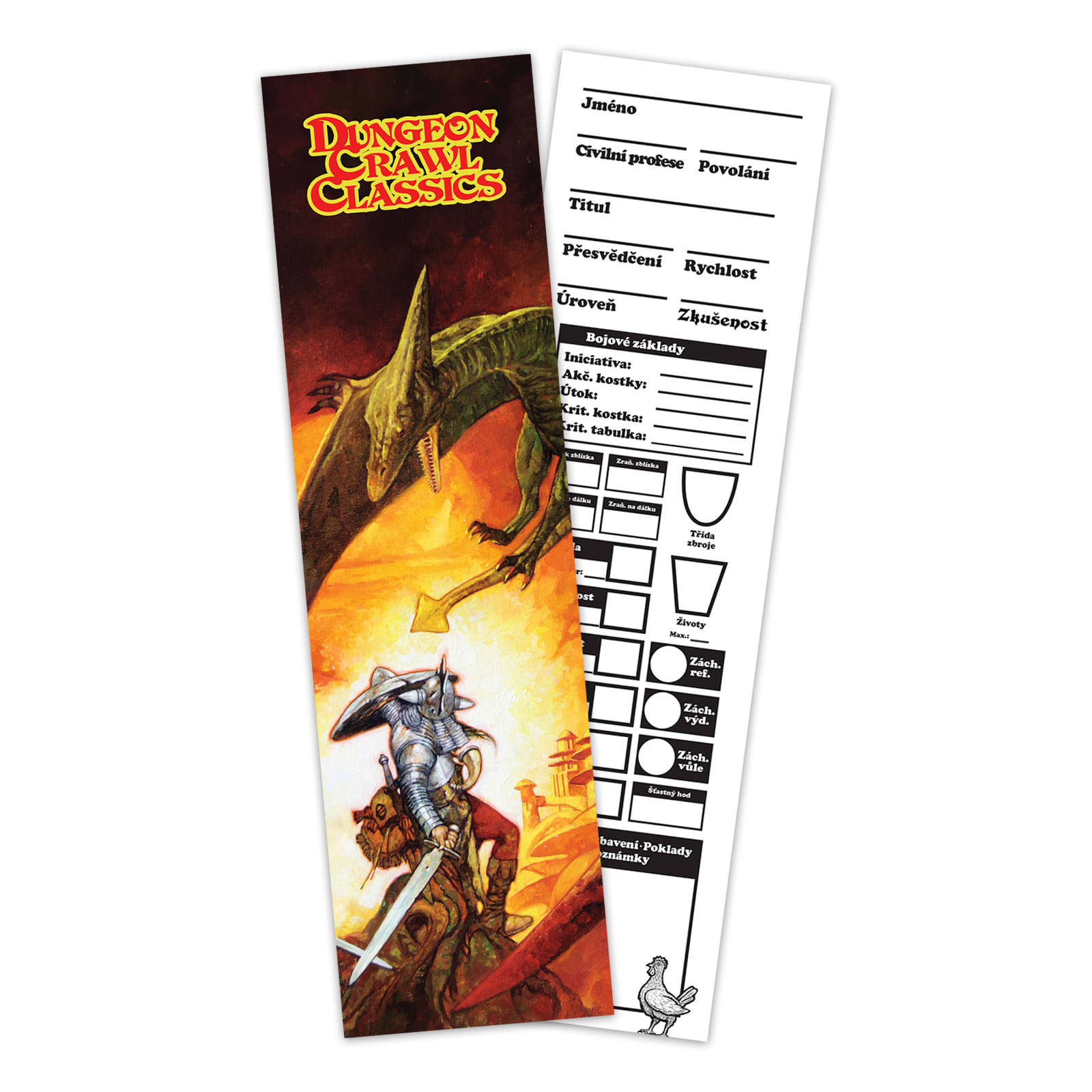 Papírová záložka s motivem ze hry na hrdiny Dungeon Crawl Classics (DCC). Druhá strana se dá použít jako minimalistický deník postavy na 0. úrovni.