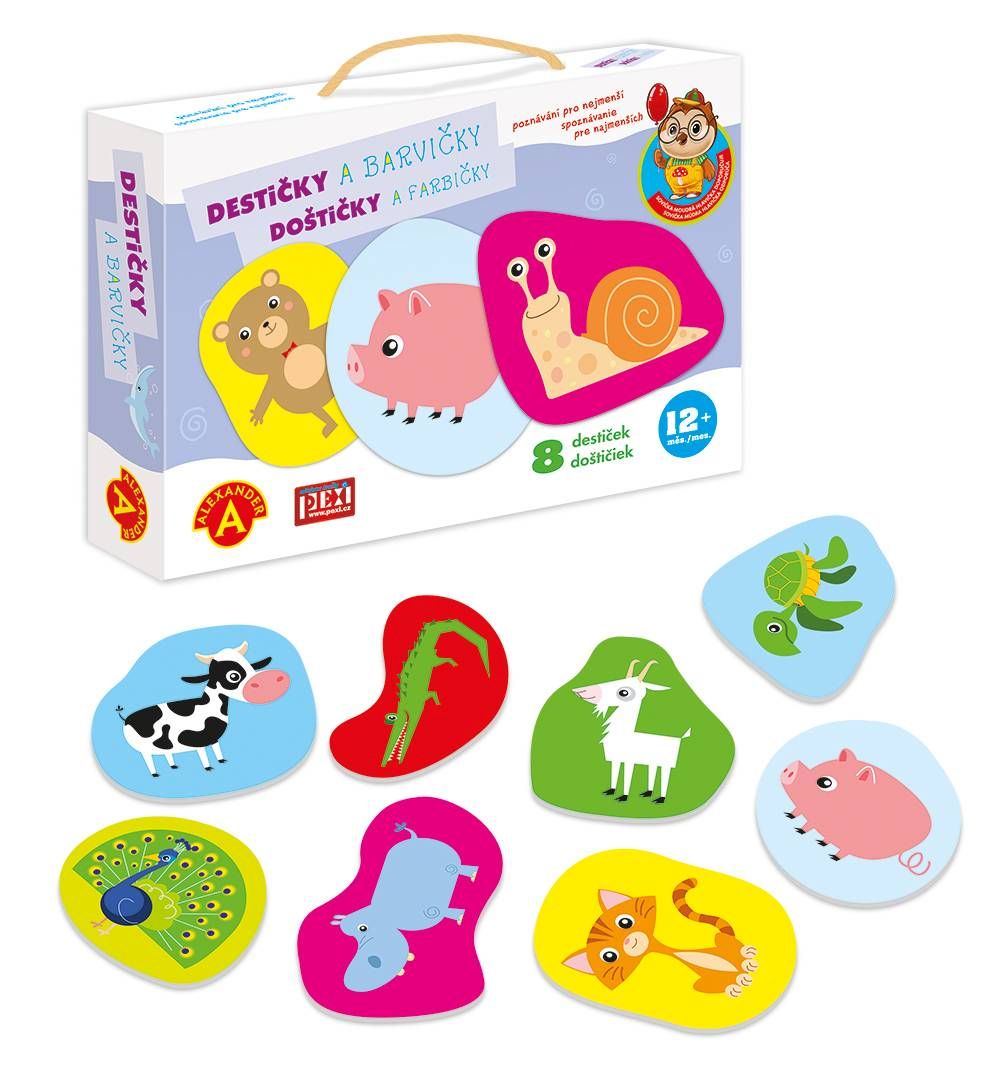Destičky a barvičky jsou pro děti od 12. měsíců. Pomocí 16 obrázků se hmatem seznamují s obrysy kartiček, vnímají barvy a poprvé se seznamují se zvířátky v lehce rozpoznatelné podobě. Rozvíjí tak hmatové a zrakové vnímání.