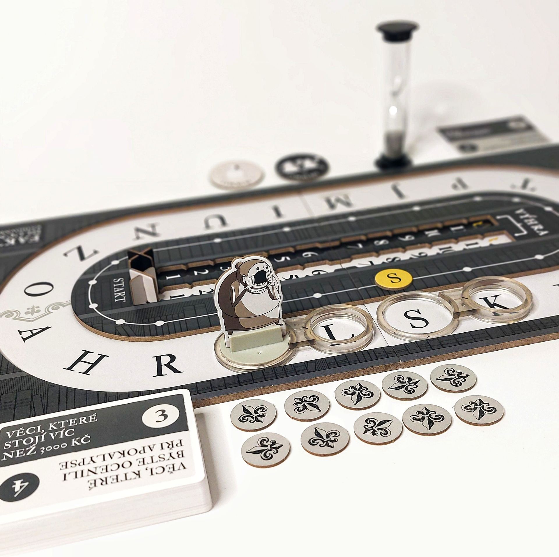 Obsah balení: 60 karet kategorií, 1 herní plán, 2 knihovníci, 20 žetonů s písmeny, 12 bonusových žetonů, 2 žetony okruhu, 2 počitadla bodů, 1 řetěz, 1 minutka, 1 česká pravidla.