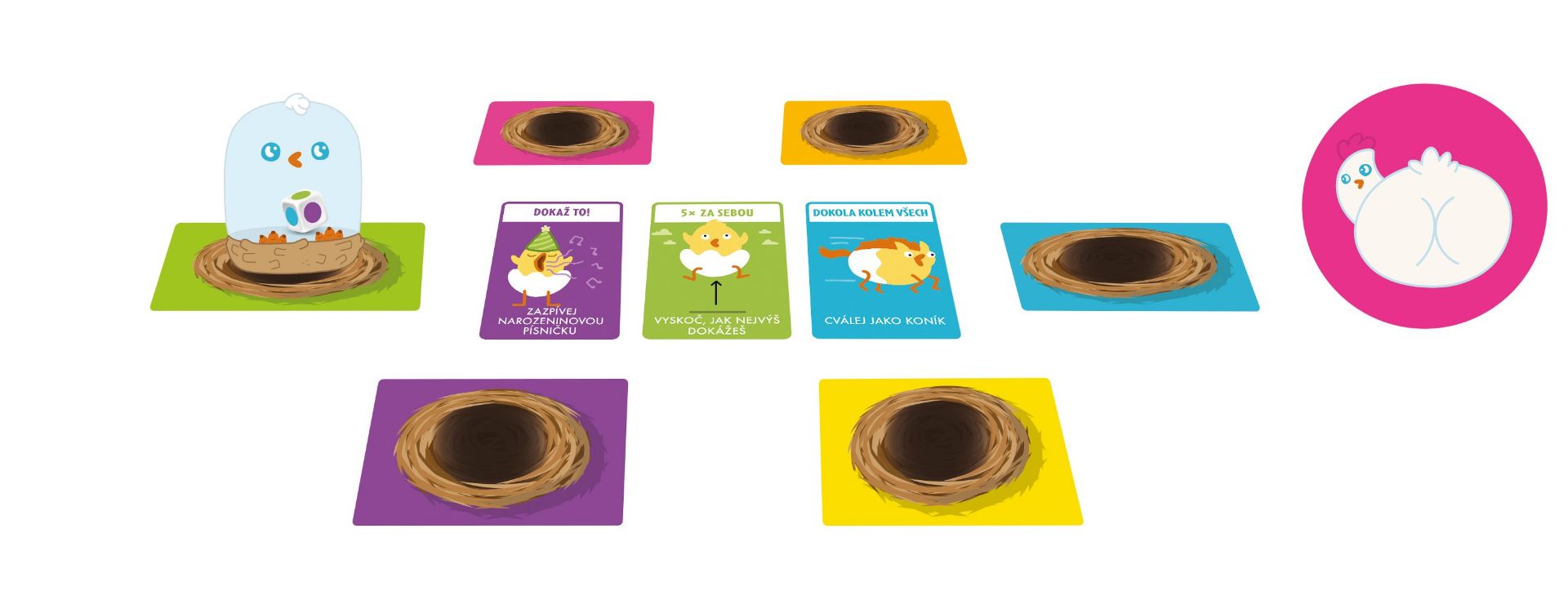 Obsah balení: 1 slepičí minutka, 45 karet aktivit, 6 herních podložek, 1 žeton slepičí prdelky, 1 česká a slovenská pravidla.