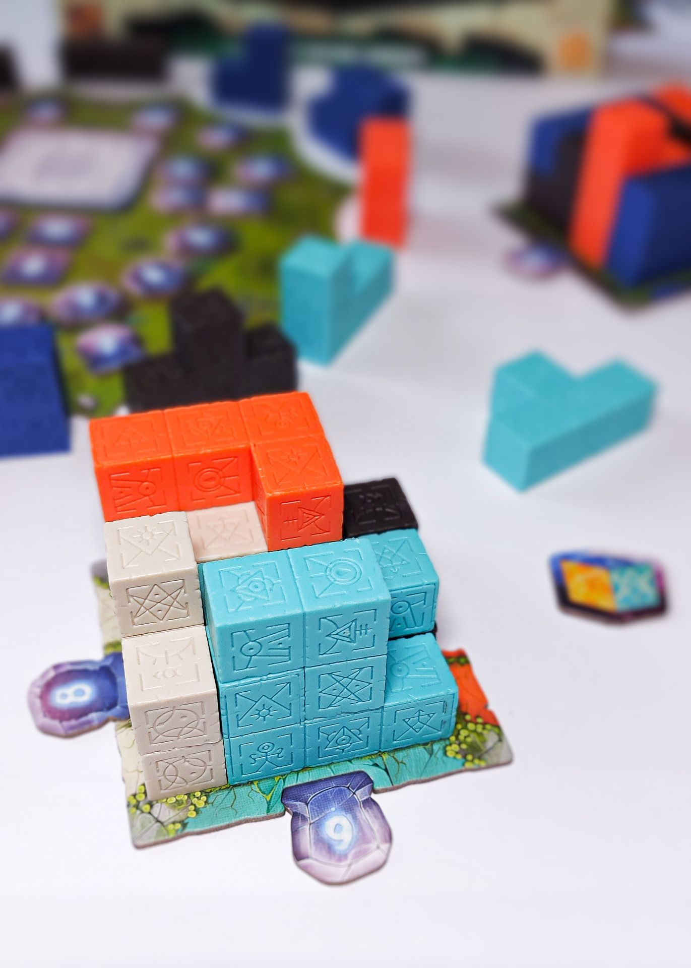Pokračujte ve svých tazích, dokud někdo nedokončí svůj 3D monolit, který měří 4x4x3 v hře pro 3-4 hráče a 4x4x4 v hře pro 1-2 hráče, po čemž dokončíte kolo. Pokud bylo proroctví splněno (např. pokud jste umístili 12 na oranžovou stranu své desky a máte alespoň 12 oranžových bloků na této straně desky), získáte body rovné hodnotě daného žetonu proroctví.