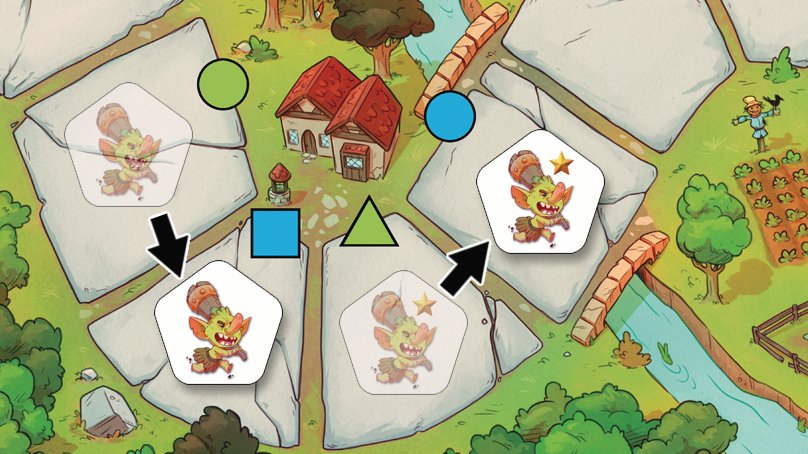 Monstrum chytíte tak, že zahrajete kartu se stejným tvarem a barvou, jakou má políčko s monstrem. Na konci kola se všechna monstra přesunou o krok blíž k hradu!