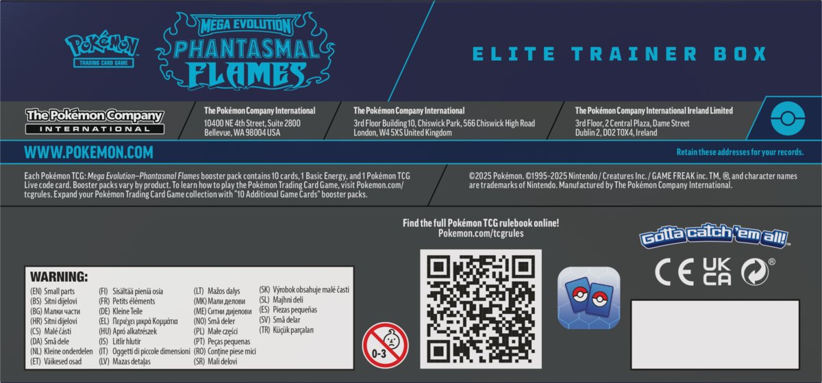Obsah balení: • 9 boosterů sady Mega Evolution - Phantasmal Flames • 1 full-art foilová promo karta Charcadet • 65 obalů na karty • 40 karet energie • anglický průvodce sadou • 6 kostek k označení kondice • 1 coin-flip kostka • 1 mince • krabička pro uschování všech komponentů • přístupový kód pro Pokémon TCG Live