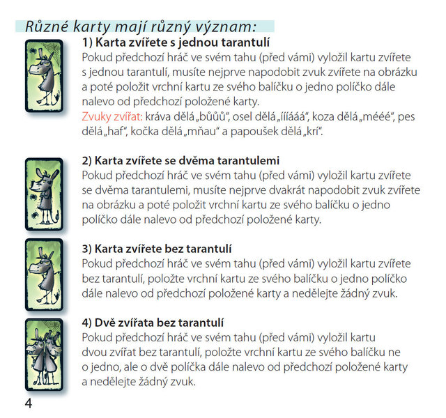 Než odhalí vrchní kartu ze své hromádky, může hráč muset napodobit zvíře na kartě předchozího hráče (např. říct "haf", "eee-ah" atd.). To závisí na některých rysech předchozí karty: Pokud ukazuje jednu nebo dvě tarantule, musí hráč napodobit jednou nebo dvakrát, jinak musí mlčet.