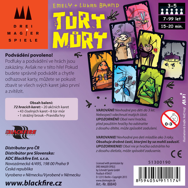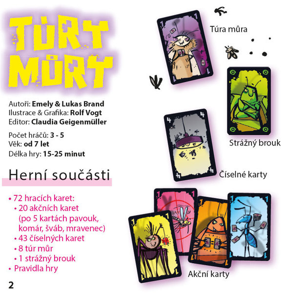 Túry Můry je zábavná a strategická hra, která se zaměřuje na podvádění a chytrou taktiku! Hráči se snaží být první, kdo se zbaví všech svých karet, přičemž mají možnost podvádět, což hře dodává vzrušení a napětí. Každý hráč začíná kolo se sadou osmi karet a jeden hráč (nejstarší) obdrží strážného brouka, který zůstává na stole po celou dobu hry. Karty jsou číslovány od 1 do 5, přičemž některé mají speciální schopnosti, které se aktivují při zahrání do hromady na vyřazení nebo při držení v ruce. Hráči se střídají v tazích a pokládají karty na hromadu, přičemž mohou hrát kartu pouze o jedno vyšší nebo nižší než ta na vrcholu. Pokud nemohou hrát, táhnou si kartu z balíčku. Podvádění je klíčovou součástí hry; hráči mohou nepozorovaně zbavovat karet tak, že je upustí na zem nebo skryjí ve svém rukávu. Hráč se strážným broukem může obviněného hráče z podvádění, přičemž výsledek obvinění může ovlivnit, kdo z hráčů se stane novým strážným. Jakmile má jeden hráč ve své ruce žádné karty, kolo končí. Ostatní hráči počítají body za zbývající karty a hra končí po počtu kol odpovídajících počtu hráčů. Hráč s nejnižším skóre vyhrává. Mogel Motte je skvělá hra na procvičení podvodu a taktiky, ideální pro skupiny přátel nebo rodiny!