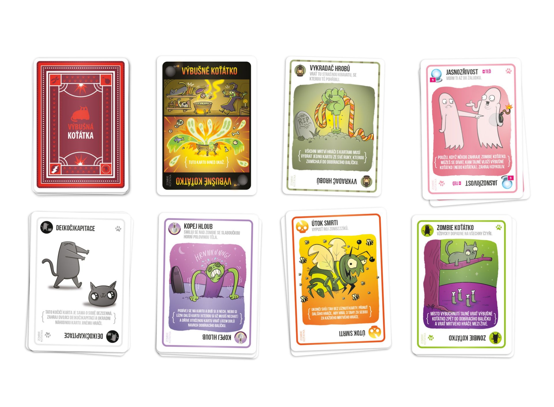 Výbušná koťátka jsou zábavná a strategická hra, která se stala jedním z nejúspěšnějších projektů na Kickstarteru, kdy na ni v roce 2015 přispělo více než 219 000 backerů. Hru vytvořili Elan Lee (XBOX, ARGs), Matthew Inman (The Oatmeal) a Shane Small (XBOX, Marvel), a k roku 2023 se po celém světě prodalo více než 25 milionů kopií. O hře Výbušná koťátka:*Tato hra je vlastně velmi strategickou verzí ruské rulety — s koťátky! Hráči si dobírají karty, dokud někdo nenarazí na Výbušné koťátko, což znamená, že exploduje, zemře a je vyřazen ze hry. Pokud hráč nemá kartu Zneškodni, která mu umožní zneškodnit koťátko pomocí například laserového ukazovátka, podrbání na bříšku nebo sendviče s šantou kočičí, prohrává. Ostatní karty v balíčku pak slouží k tomu, aby hráči pomohli se vyhnout Výbušným koťátkům nebo je nastrčili na cesty ostatním. Vtipné ilustrace a ještě vtipnější texty vás pobaví a vtáhnou do hry, kterou budete chtít hrát pořád dokola. Každá karta je originální! Pravidla hry jsou velmi jednoduchá a dají se vysvětlit za pár vteřin. Přidáním dalšího herního balíčku (například z přisprostlé verze Výbušných koťátek nebo další klasické verze) můžete navýšit počet hráčů až na 9. Pro fajnšmekry a majitele Zombie koťátek je tu rozšířená varianta hry s názvem Zombie apokalypsa: Exploding Kittens je kočičková verze ruské rulety. Hráči se střídají v dobírání karet, dokud někdo nevytáhne Výbušné koťátko a neztratí hru. Balíček obsahuje karty, které vám umožňují vyhnout se explozi tím, že nahlédnete do karet předtím, než si vytáhnete, donutíte svého protivníka vytáhnout více karet nebo zamícháte balík. Každým tahem se hra stává napínavější, protože méně karet v balíčku znamená větší šanci na to, že vytáhnete koťátko a explodujete v ohnivé kouli kočičí hyperboly!