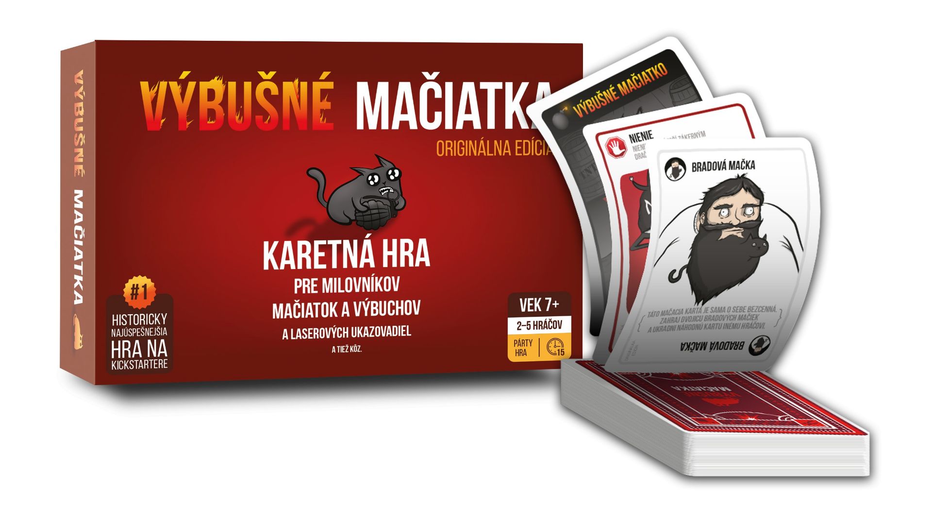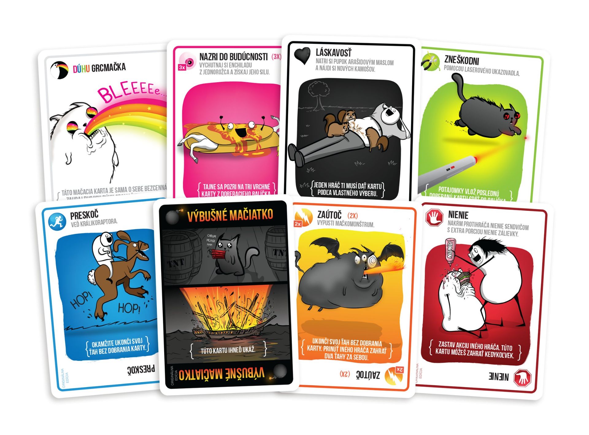 Úlohou všetkých ostatných kariet v balíčku je pomôcť hráčom chrániť sa pred výbušnými mačiatkami, alebo ich nastrčiť do cesty ostatným. Vtipné ilustrácie s ešte vtipnejšími textami vás pobavia a úplne vtiahnu do hry, ktorú budete chcieť hrať stále dokola. Každá karta je originál a pravidlá hry sú veľmi jednoduché a vysvetlené za pár sekúnd.