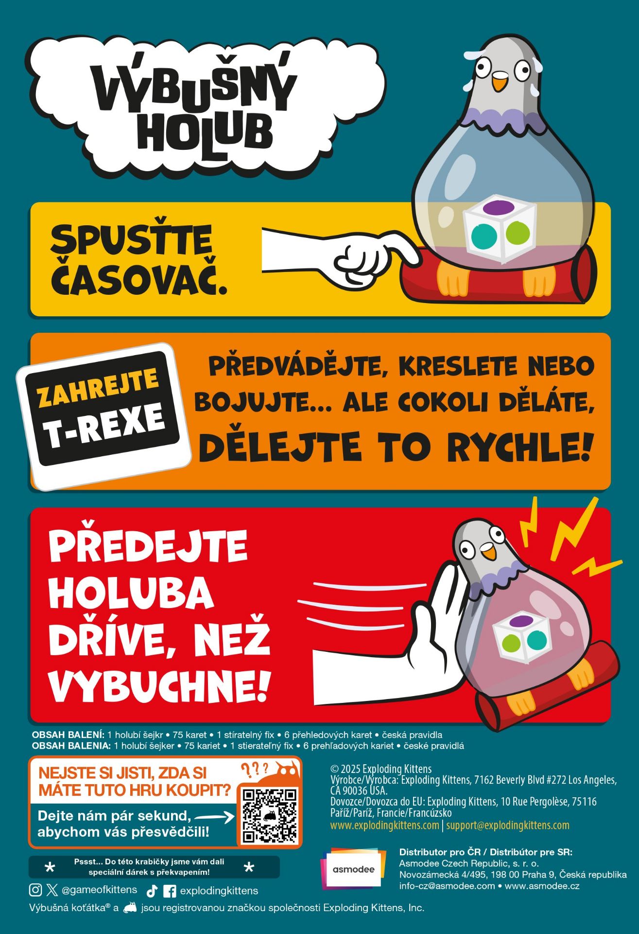 Výbušný holub je rodinná párty hra, kde hrajete rychle, hádáte ještě rychleji a nesmíte být přistiženi, když holub vybuchne.
