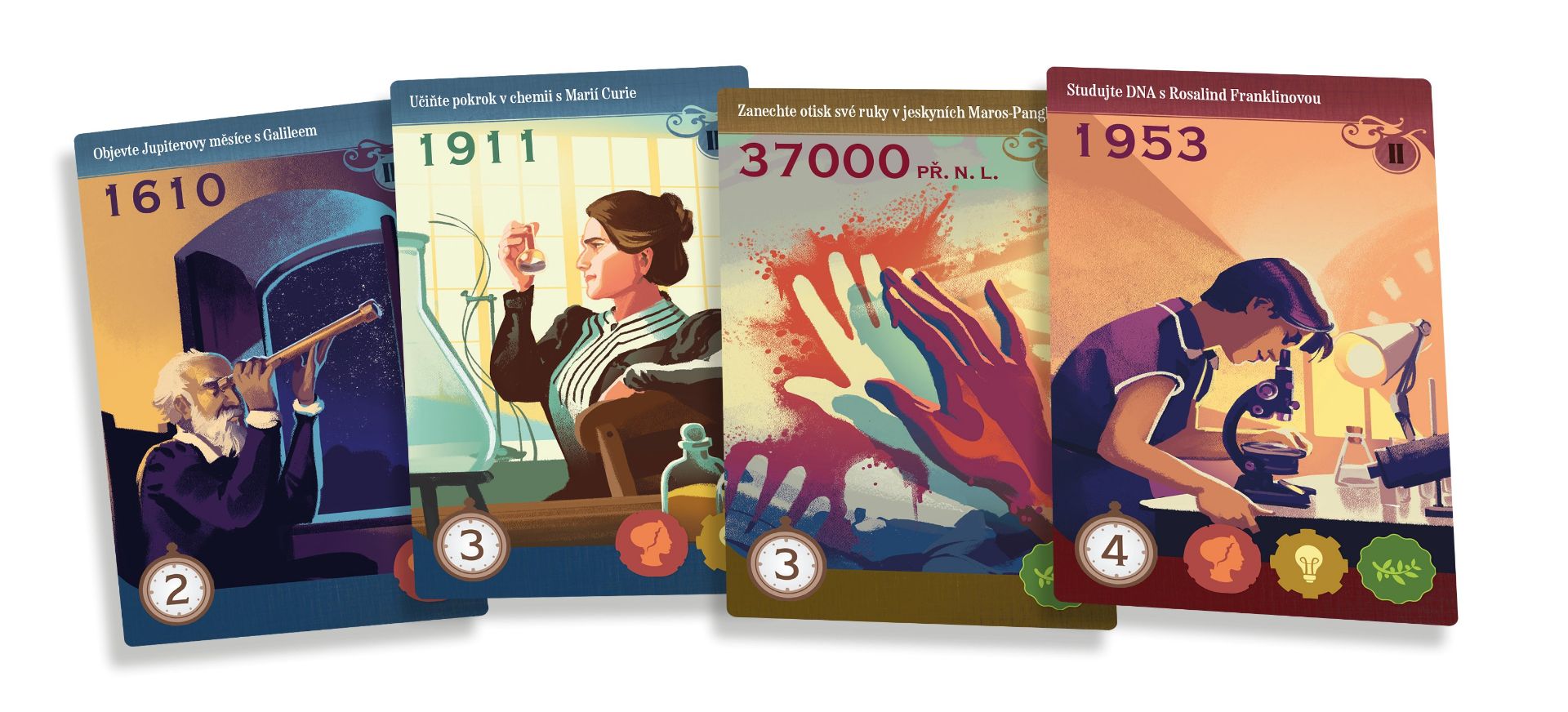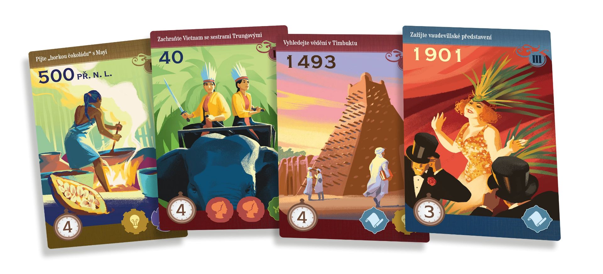 Obsahuje více než 100 karet historie, z nichž každá je krásně ilustrovaná a doplněná poučnými texty, které popisují rozmanité a úžasné dějiny našeho světa. Česká verze hry je 2. edice a obsahuje skvělý sólo mód, který byl v 1. edici vydán zvlášť.