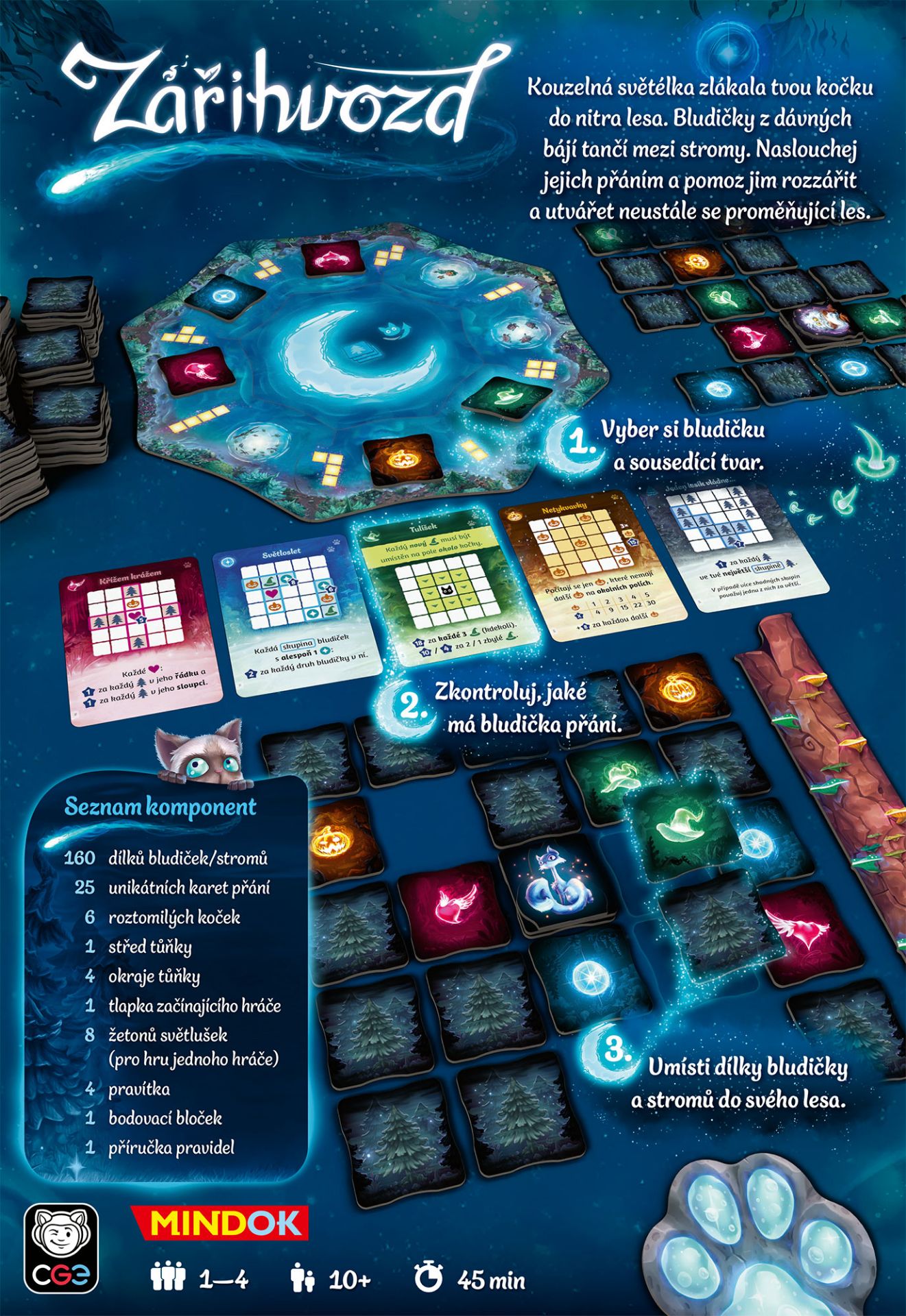 Vstupte do Zářihvozdu, budujte svůj les v rostoucí mřížce a strategicky umisťujte Bludičky a stromy tak, abyste splnili jejich specifická přání. Využijte speciální schopnosti své Kočky k manipulaci s nabídkou dílků a k získání těch nejlepších tvarů. Tato abstraktní strategická hra s krásnými ilustracemi trvá 3 kola a vyžaduje pečlivé plánování a adaptaci na stále se měnící podmínky bodování.